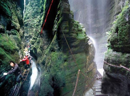 坐龍峽風(fēng)景區(qū) 坐龍峽擁有中國第一條特種游道。所有游道均建于峽谷深處,依山取勢,既經(jīng)細心雕琢聽卻又渾然天成。粗樸的板栗木棧道,可以讓你零距離的親近那一潭碧幽、聽聞山泉叮咚;精巧的跳墩,可以讓你媳戲流泉、觸感溪瀑;原質(zhì)的石坎道,讓你不得不調(diào)動全部的身心能量悉心攀援、感悟峽谷;有驚無險的鐵梯,讓你伴著腳下轟鳴的溪水,在驚怵中體味一份快慰。出口處的土家山寨,保留了古樸獨特的生活習(xí)俗。一塊臘肉就一口醇香的“苞谷燒”會讓你洗去所有的疲憊,在輕松中憨厚的主人向你講述過去強人出沒的故事......