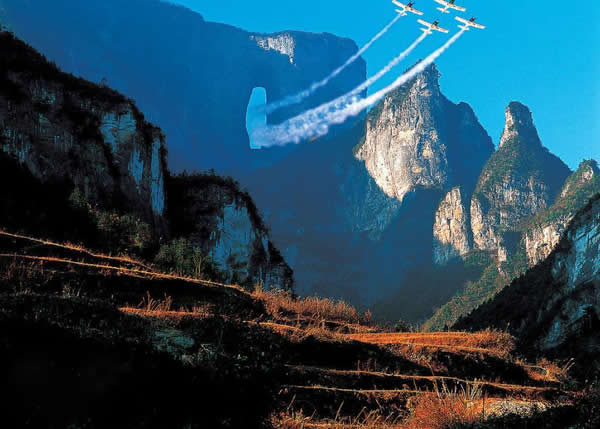 天門洞風光圖片 天門洞景觀 1700多年來,這一道奇絕天下的勝景吸引著無數(shù)的探訪者趨之若鶩。特別是在1999年,世界特技飛行大師駕機穿越天門洞,在全球引發(fā)了轟動效應,收看現(xiàn)場直播的觀眾達到8億之多。