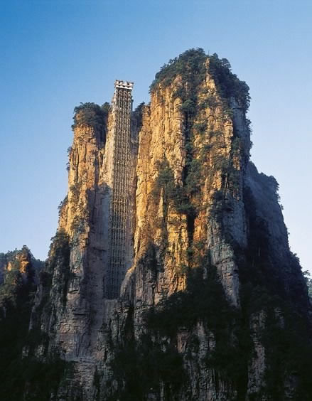 百龍?zhí)焯輬D片 2005年4月8日,張家界百龍?zhí)焯萑?hào)電梯通過驗(yàn)收正式投入運(yùn)營(yíng),這標(biāo)志著張家界核心景區(qū)旅游黃金周首條游客無須排隊(duì)通道誕生.。隨著張家界對(duì)景區(qū)核心袁家界的深度開發(fā)和金鞭溪與賀龍公園兩條紅色旅游線路的確立,選擇從金鞭溪乘百龍?zhí)焯萸巴医缂疤熳由劫R龍公園觀景的游客將越來越多,百龍?zhí)焯萑?hào)電梯開通后,它可為游客提供更可靠的交通保障,它將天子山、金鞭溪等精品游覽線連為一體,解決了多年困擾景區(qū)的交通瓶頸問題。游客乘百龍?zhí)焯,只要?jīng)過1分58秒鐘,便仿佛進(jìn)入如詩(shī)如畫的天上人間,欣賞有張家界“后花園”之稱的袁家界大峰林神奇美景。