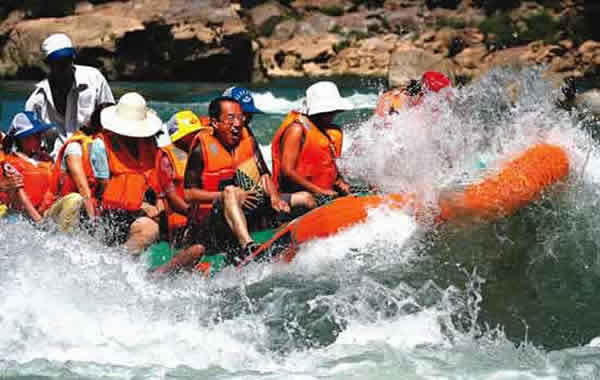 河水更為兇悍強(qiáng)勁,昂頭撤蹄,湍湍東去。一灘連一灘,一浪挽一浪。百里河流百里灘,百里流水百里浪。茅巖河水無情地撞擊著河中根基深厚的礁石,盡管撞擊得頭破血流,斷腸裂肺,粉身碎骨,依然無怨無悔,從不停歇地演繹著生命的壯觀。被撕碎的生命化成點(diǎn)點(diǎn)銀珠拋上天空,繼而又落回永不消逝的軀體上,織就了一幅生生不息的王母娘娘灑降甘露圖。而被河水沖撞了千百年仍然傲然屹立的礁石,撕破了河水剛剛要向人展示玉脂般的肌膚,又被洶涌而至的河水淹沒,再次擊起滿天銀花。前進(jìn)與阻擋相搏發(fā)生的巨大轟鳴,在河谷里一次又一次的回響,在群山中一次又一次地震蕩。若乘坐皮筏或小舟在河上漂流,一種無以言狀的享受游走在每根神經(jīng)。人時(shí)而被軟若無骨的河水拋上浪尖,時(shí)而又被它牽扯著跌入峰谷。會不由自主地發(fā)出享受大自然賦予的刺激的無險(xiǎn)驚叫。尖叫聲與浪濤聲匯成了一支歡樂的樂章。