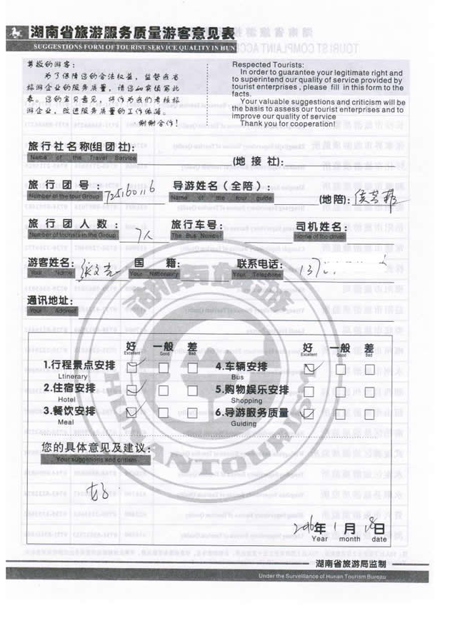 現(xiàn)在位置:首頁 -> 西部國(guó)旅->旅游質(zhì)量反饋 -> 2016-1-16 長(zhǎng)沙張文光一行7位貴賓 天門山、黃龍洞,寶峰湖兩晚三日游