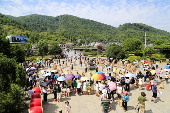 7月29日上午9點(diǎn)30分,由張家界市人民政府主辦,張家界市委宣傳部、市旅游和外事僑務(wù)委員會(huì)、市文體廣電新聞出版局、武陵源區(qū)人民政府承辦,黃龍洞景區(qū)協(xié)辦的“絕版張家界,最炫民族風(fēng)”張家界民俗活動(dòng)月第三場活動(dòng)在黃龍洞景區(qū)啟動(dòng),F(xiàn)場以土家人慶祝豐收的鼓舞拉開序幕,土家鼓舞歡悅的節(jié)奏,夸張的舞姿開場就吸引了幾千游人和當(dāng)?shù)厝擞^看。草根夫妻檔歌手,張家界“山水組合許勇、舒維亮麗的服飾,野性的嗓音……”以一首《我在高山唱》歌曲,征服現(xiàn)場游客,贏得雷鳴般的叫好聲。