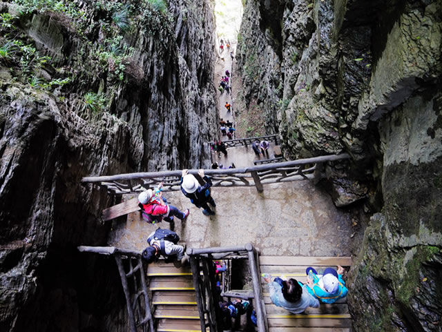 天梯棧道的木板很窄,依次往下延伸,就像一架天梯,把我們送往迷人的仙境。這道“天梯”不是天賜的,而是靠了當(dāng)?shù)氐纳矫瘢道K索,手扶峭壁,肩扛背馱,將這些堅(jiān)硬而沉重的石頭從山頂一塊一塊地運(yùn)來、鋪好,鋪成現(xiàn)在這條看似險(xiǎn)峻、其實(shí)結(jié)實(shí)安全的1600多級(jí)石階棧道。