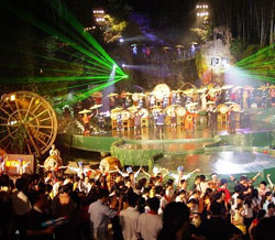 聚會廳是黃龍洞十三個大廳中面積最小的一個廳,面積約6000平方米。對面燈火闌珊、石筍林立的地方是龍舞臺,相傳是龍王爺跳舞的地方,每年的今天,龍王爺都在這里舉行一場盛大的舞會,在旁邊的峭壁上還有一個華麗的包廂,相傳是龍王爺?shù)男∨畠汉退男纳先苏谀抢锛s會。