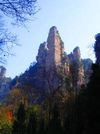 從仙人橋去老屋場,但見深谷里密密麻麻羅列上百座石峰,活像一群威武雄壯的將士列隊聽令,相傳這是向王天子的神兵在聚會。神話雖不可靠,但石峰如此集中壯觀,在武陵源也屬罕見。我想引用一位美術(shù)大師的話:“豈有此理,莫名其妙,說也不信,到此方知”。不看神兵聚會,怎知石峰成林。