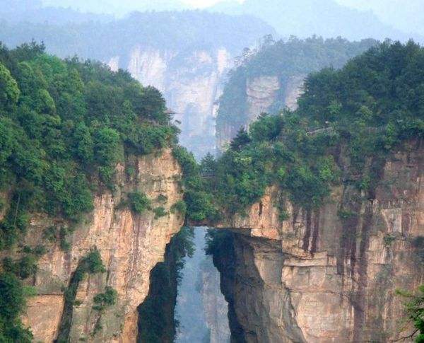 “后花園”至天下第一橋,有一條全長2000多米的游道,路面多為白色的條石鋪成,站在遠處觀望,很像一條白色的綢帶打了兩個結(jié),一頭系在“迷魂臺”,一頭第在“天下第一橋”。信步漫游,沿途可欣賞到“拜仙臺”、“百丈絕壁”、“小洞天”、“情人谷”等別有情趣的景點,這里海拔不高,一般不受氣候影響,慢慢品味,定會使您賞心悅目。“天下第一橋”是張家界“十大絕景”之一。也是袁家界的標志性景點,它是居于兩山之間形成的一座天然石橋,而兩山原為一體,橋身是兩山相連的關(guān)鍵部分,但因中間石質(zhì)較為薄弱,由于風化、崩塌作用的影響,又經(jīng)過日曬雨淋、流水洗刷、山洪沖擊,久而久之,終于形成今天這一特別的奇景……。自杉刀溝上袁家界,沿絕壁頂部邊緣遨游,至于中坪“觀橋臺” 遙望千米之外,只見一天然石橋凌空飛架兩峰之巔,氣勢磅礴,奇?zhèn)ソ^倫,被稱為“天下第一橋”。石橋?qū)拑H3米,厚5米,跨度約50米,相對高度近400米。天下第一橋與夫妻巖并稱“張家界雙絕”!疤煜碌谝粯颉睒蛎鎸拑擅祝袼拿,跨度為二十多米,高度為三百多米,是世界是迄今為止所發(fā)現(xiàn)落差最高的天然石橋。